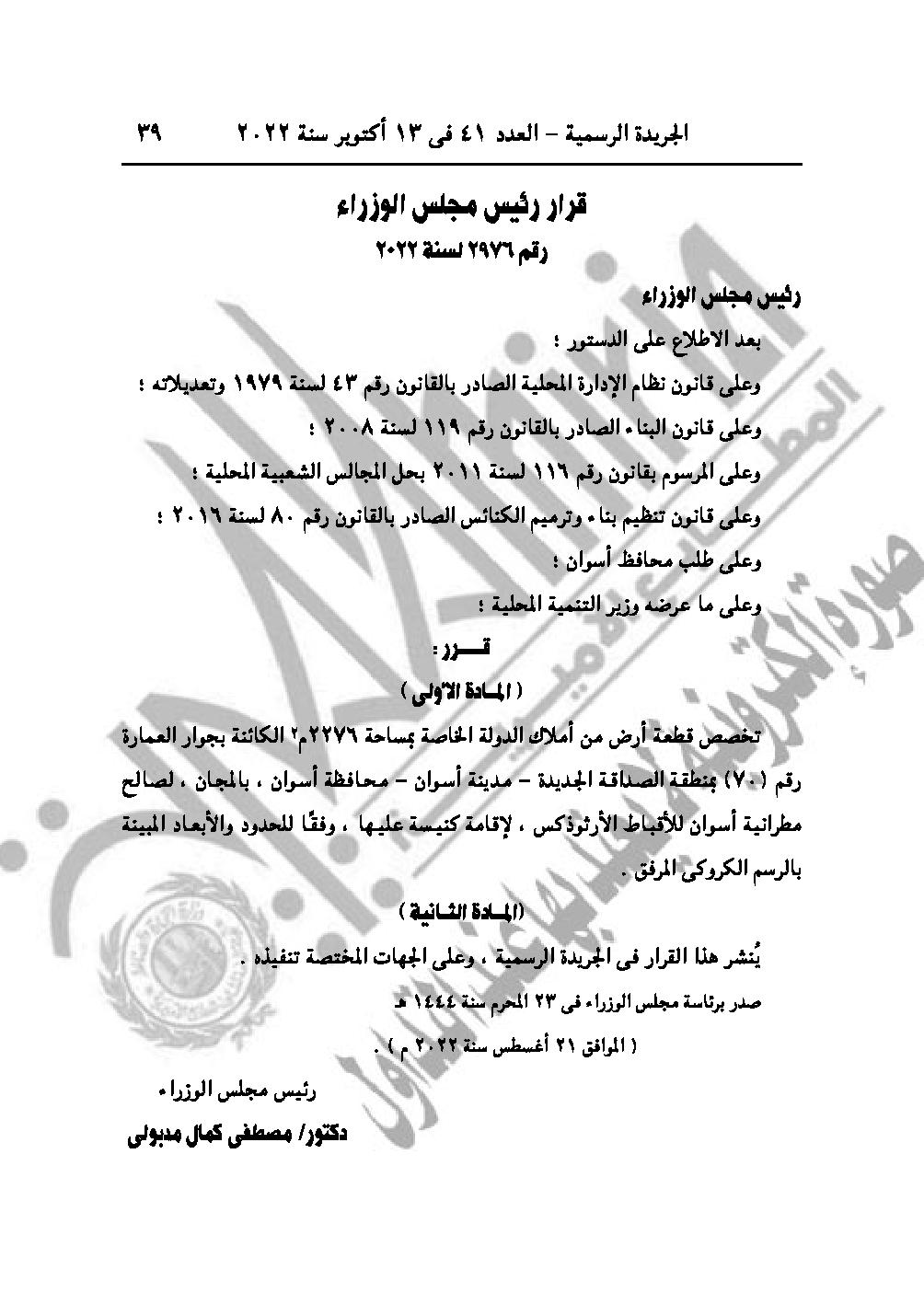 - والقرار رقم 2976 لسنة 2022، بتخصيص قطعة أرض من أملاك الدولة الخاصة بمساحة 2276 متر مربع، الكائنة بالعمارة رقم (70) بمنطقة الصداقة الجديدة بمدينة أسوان، بالمجان، لإقامة كنيسة.