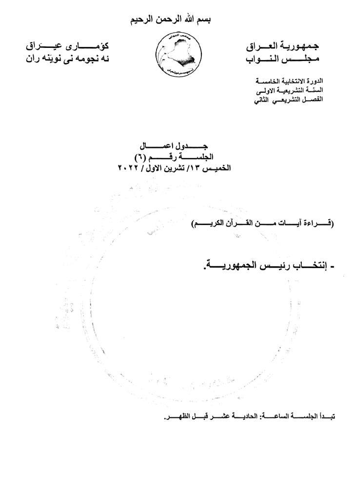 وأعلن رئيس مجلس النواب محمد الحلبوسي، في ختام جلسة يوم الثلاثاء، تحديد اليوم الخميس، موعدًا لعقد جلسة بفقرة واحدة مخصصة لانتخاب رئيس الجمهورية وفقا للنصوص الدستورية، موجهًا بتوزيع السير الذاتية للمرشحين على النواب، فيما حددت الدائرة الإعلامية لمجلس النواب الساعة الحادية عشرة موعدًا لعقد جلسة انتخاب رئيس الجمهورية.