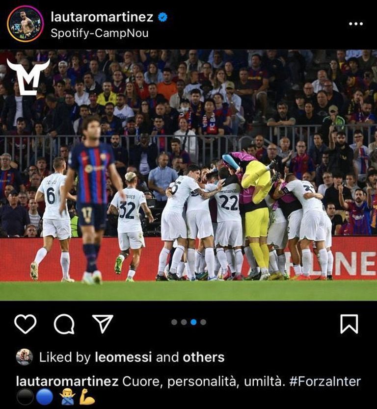 واحتفل الأرجنتيني لاوتارو مارتينيز مهاجم إنتر ميلان بالتعادل، بعد أن قدَّم مباراة رائعة بتسجيل هدف وصناعة مثله، ونشر مجموعة من الصور له في المباراة بتعليق: "القلب والشخصية والتواضع"، لكن الغريب في الأمر والذي أثار غضب جماهير برشلونة، هو أن نجمها السابق الأسطوري ليونيل ميسي سجل إعجابه بمنشور لاوتارو مارتينيز، في الوقت الذي أصبح فيه البارسا مهددا بالإقصاء من دور المجموعات.