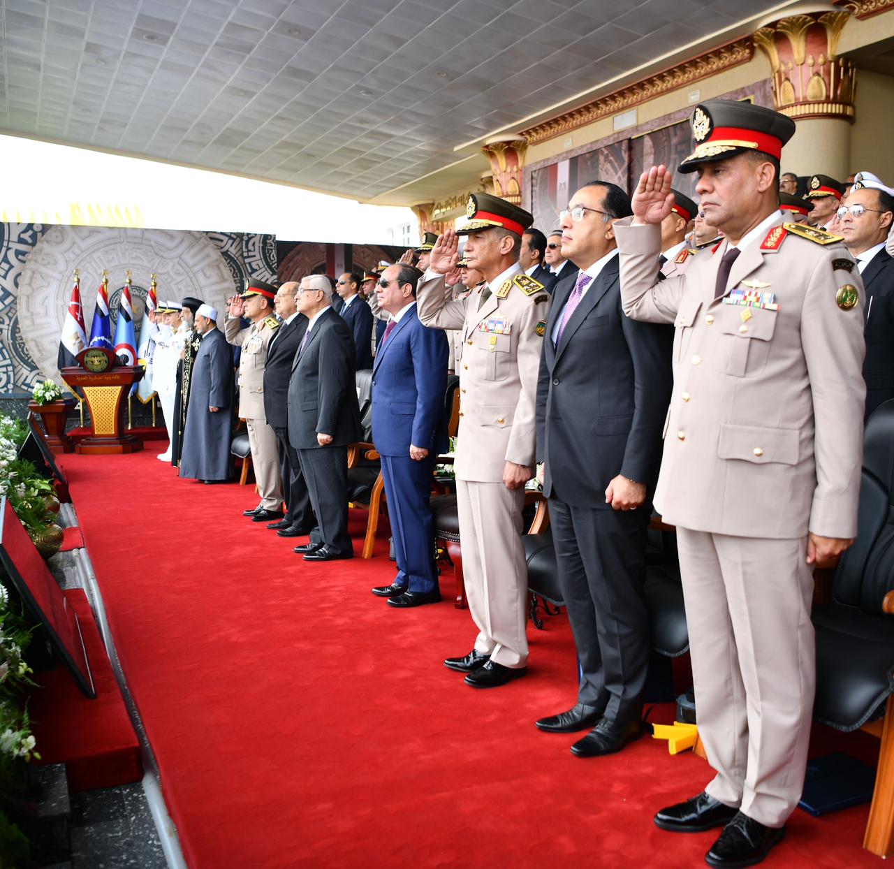 كما شهد الرئيس السيسي تسليم وتسلم القيادة من دفعات الخريجين للدفعات الجديدة من الكليات والمعاهد العسكرية بالكلية الحربية.