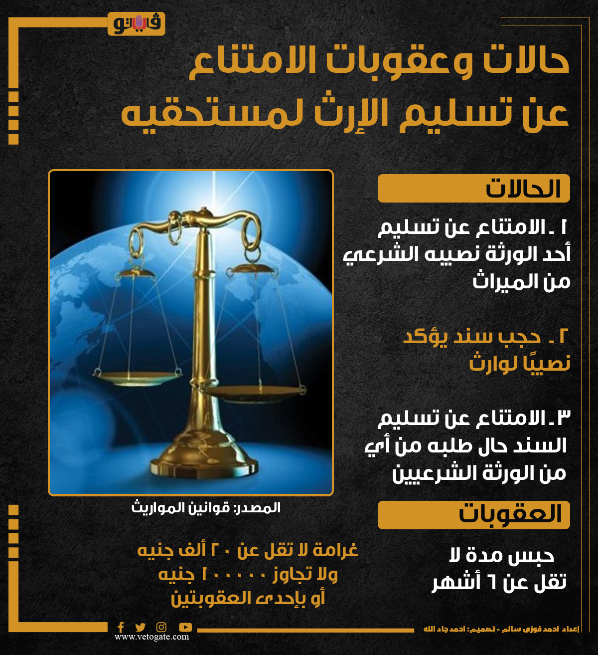 حالات وعقوبات الامتناع عن تسليم الإرث لمستحقيه | إنفوجراف الخميس 13/أكتوبر/2022 - 07:10 م 10/13/2022 7:10:57 PM عدالة القوانين احمد فوزى سالم شارك طباعة 18 حجم الخط شارك طباعة