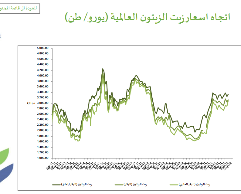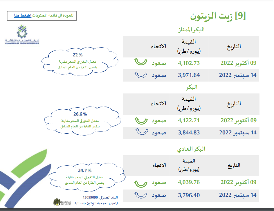 واشار التقرير الى ارتفاع السعر بنسبة 34.7% عن نفس الفترة من العام السابق وذلك وفقا لجمعية الزيتون بإسبانيا.