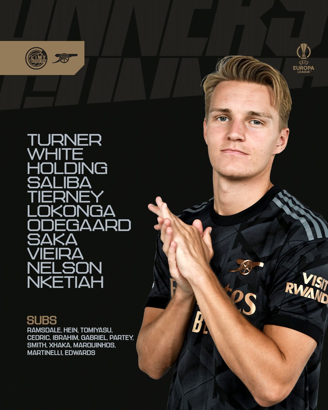 أعلن مايكل أرتيتا المدير الفني لنادي أرسنال الإنجليزي، تشكيل فريقه لمواجهة بودو جلميت النرويجي على ملعب "اسبميرا"، في المباراة التي تقام في تمام الساعة 6:45 مساء اليوم الخميس، في إطار منافسات الجولة الرابعة من دور المجموعات في بطولة الدوري الأوروبي.