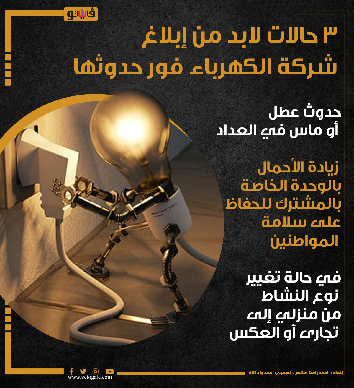 3 حالات لابد من إبلاغ شركة الكهرباء فور حدوثها| إنفوجراف الخميس 13/أكتوبر/2022 - 06:46 م 10/13/2022 6:46:42 PM أحمد رأفت منتصر شارك طباعة 18 حجم الخط شارك طباعة