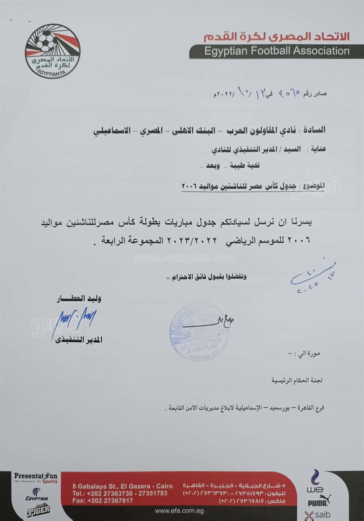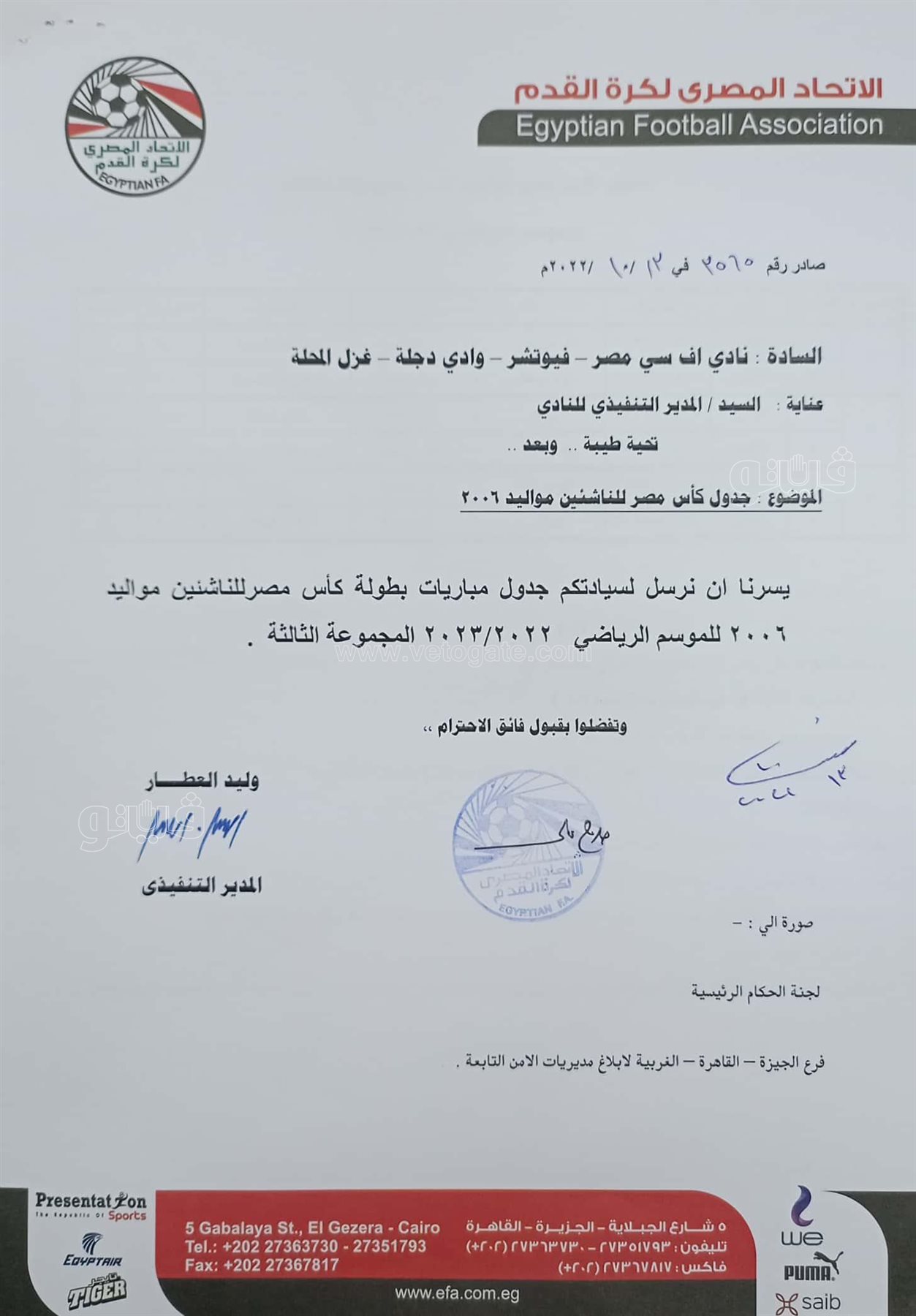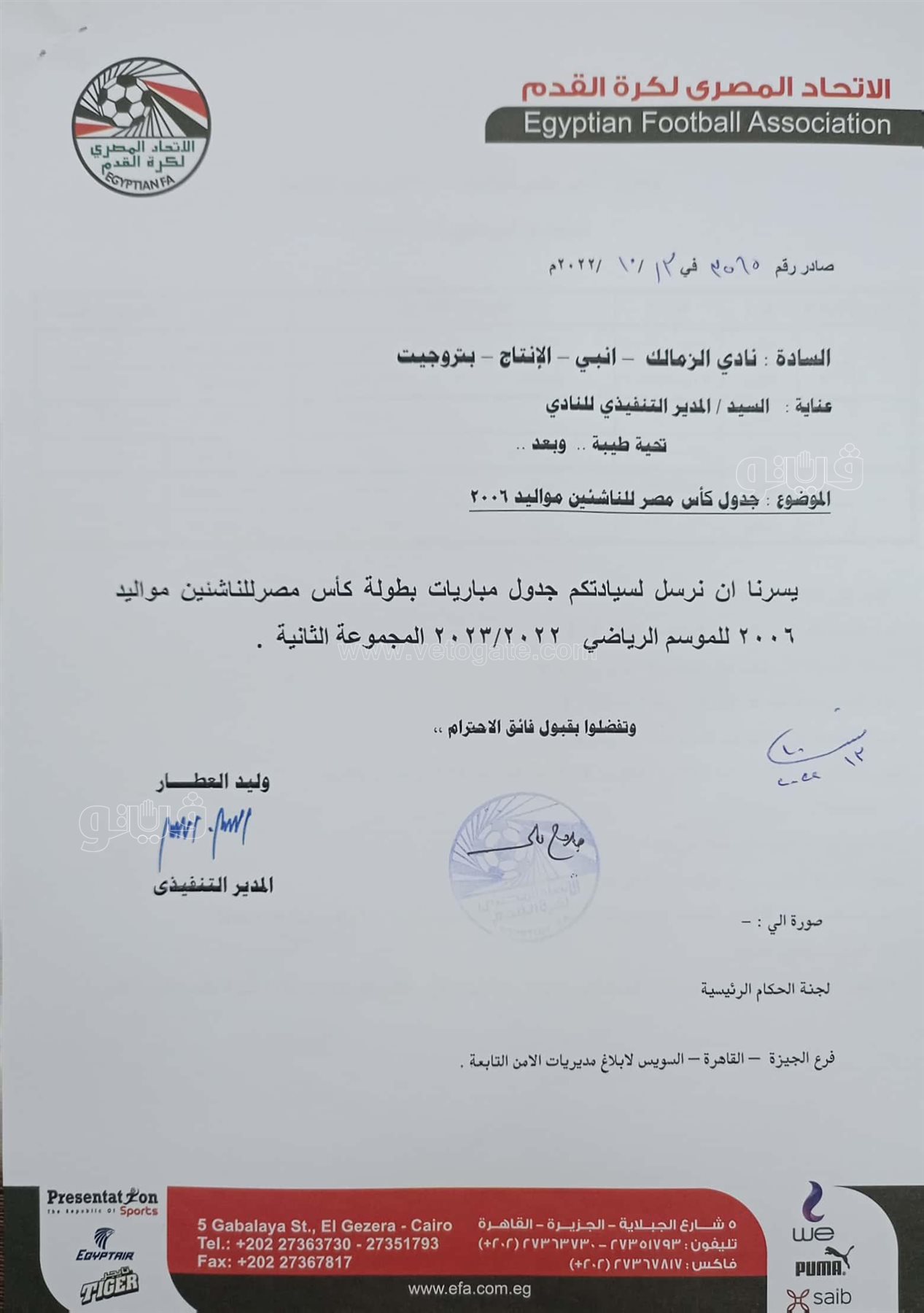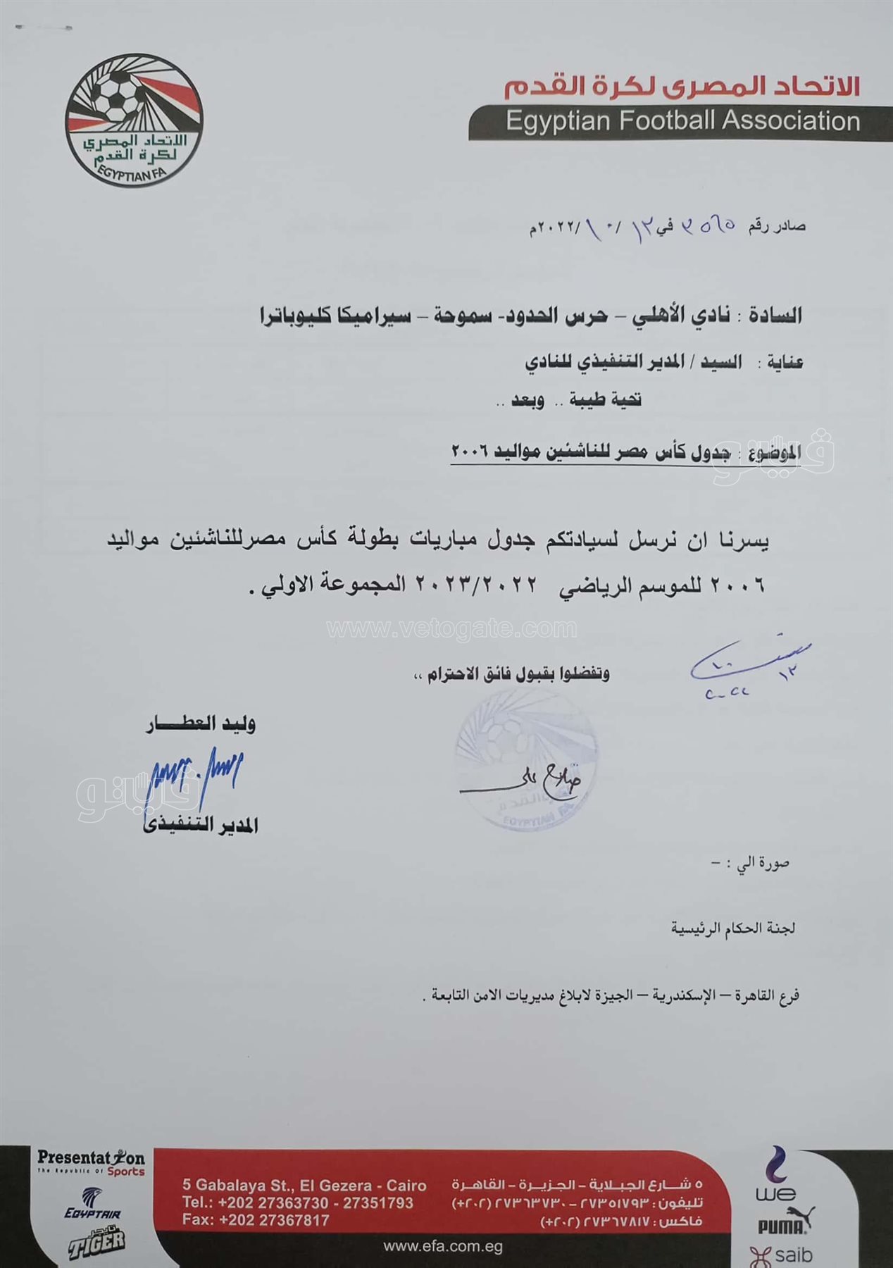 من ناحية أخرى، قرر مجلس إدارة اتحاد الكرة إسناد رئاسة بعثة منتخب الناشئين مواليد 2006، في الجزائر إلى عضو المجلس إيهاب الكومي.