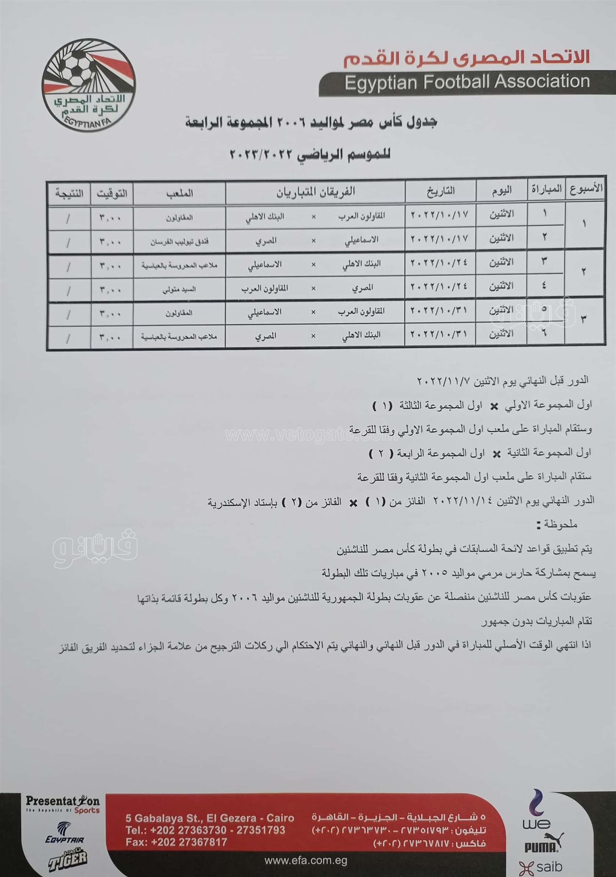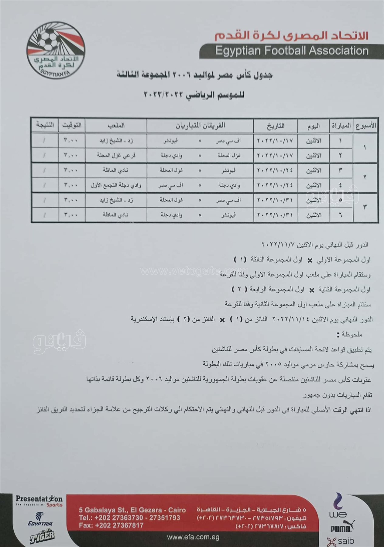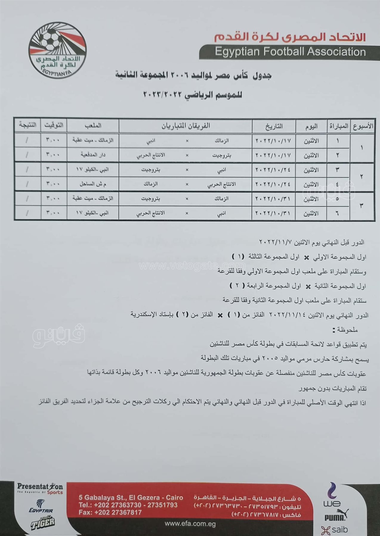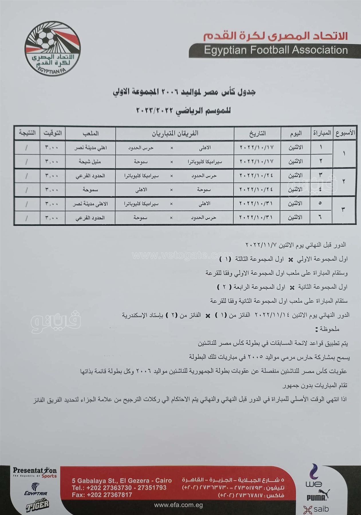جدول مباريات كأس مصر للناشئين مواليد 2006