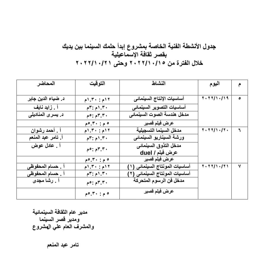 جدول أنشطة المشروع القومي "السينما بين يديك" بالإسماعيلية