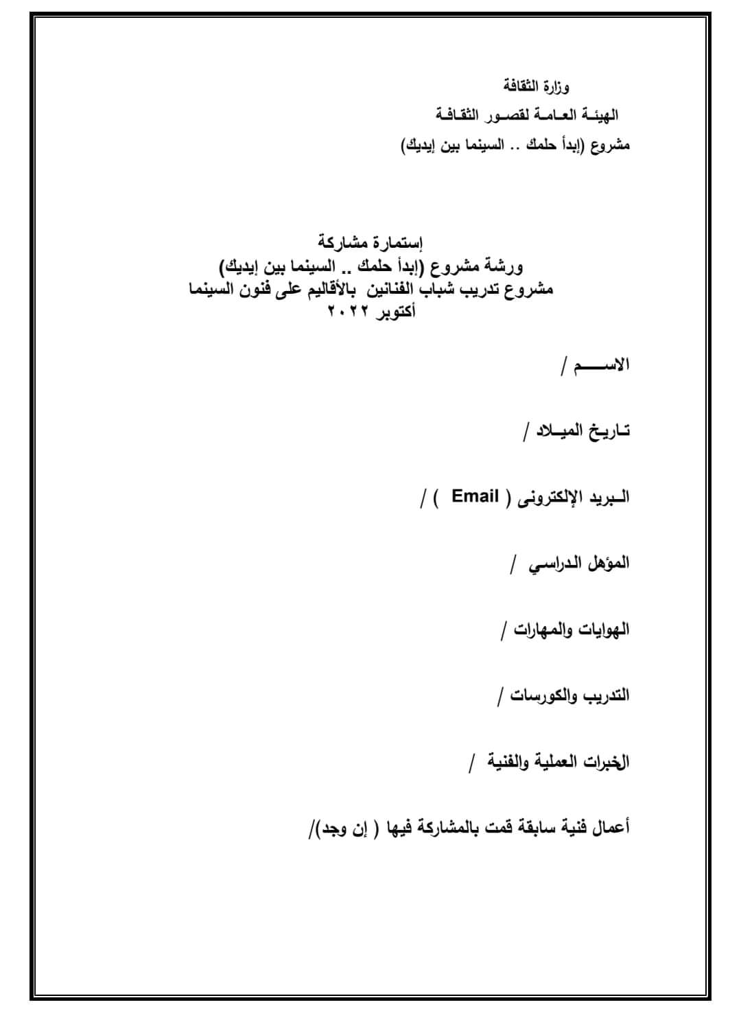 ويهدف المشروع القومي " إبدأ حلمك.. السينما بين ايدسك" إلى تيسير دراسة السينما وفنونها المختلفة، للراغبين في دخول هذا المجال حيث يتناول المشروع كافة النواحى الفنية لصناعة فيلم سينمائي، ويتيح المشروع دراسة السينما لكافة الفئات العمرية والمؤهلات الدراسية علما بأنه لايقل أعمار المشاركين فى ورشة السينما عن 16 سنة.