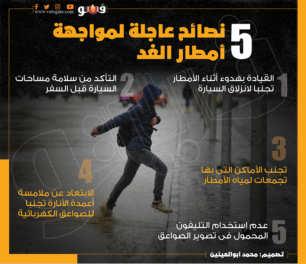 5 نصائح عاجلة لمواجهة أمطار الغد| إنفوجراف الجمعة 14/أكتوبر/2022 - 08:57 م 10/14/2022 8:57:07 PM امطار رعدية شارك طباعة 18 حجم الخط شارك طباعة مياه الأمطار التليفون المحمول أعمدة الإنارة