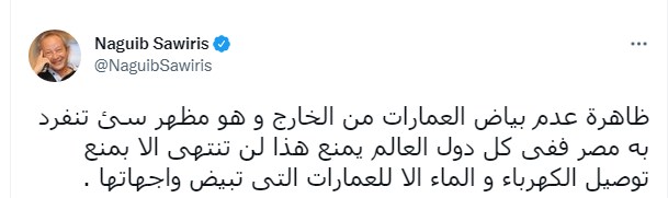 وكتب المهندس نجيب ساويرس تغريدة على تويتر قال فيها: "ظاهرة عدم بياض العمارات من الخارج هو مظهر سيء تنفرد به مصر ففى كل دول العالم يمنع هذا.. هذا لن ينتهى إلا بمنع توصيل الكهرباء والماء إلا للعمارات التى تبيض واجهاتها."