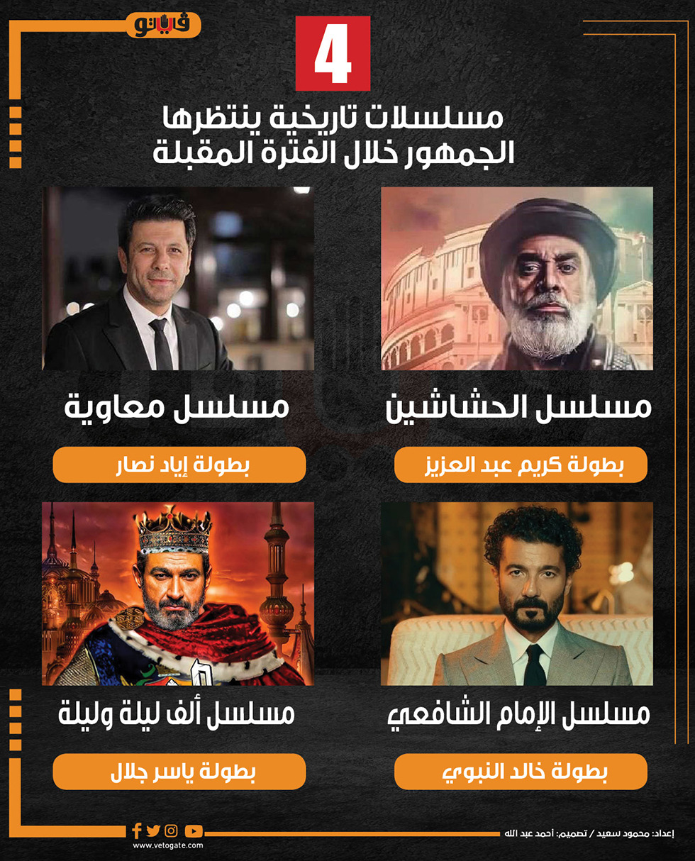 4 مسلسلات تاريخية ينتظرها الجمهور خلال الفترة المقبلة | انفو جراف الأحد 16/أكتوبر/2022 - 12:53 م 10/16/2022 12:53:08 PM كريم عبد العزيز محمود سعيد شارك طباعة 18 حجم الخط شارك طباعة كريم عبد العزيز خالد النبوى ياسر جلال مسلسل الحشاشين مسلسل معاوية مسلسل الإمام الشافعي