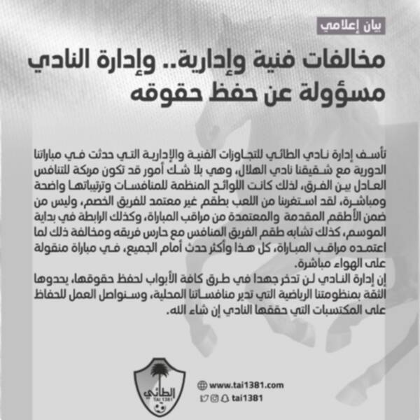 أصدر نادي الطائي السعودي بيانًا رسميًا حول مباراة الهلال السعودي والتي جمعتهما ببطولة الدوري، والتي خسرها الفريق بنتيجة 3-2.