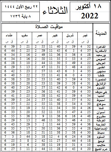 مواقيت الصلاة اليوم وفقًا للتوقيت المحلي لمدينتي القاهرة والإسكندرية وعدد من مدن ومحافظات الجمهورية من واقع بيانات الهيئة العامة للمساحة: