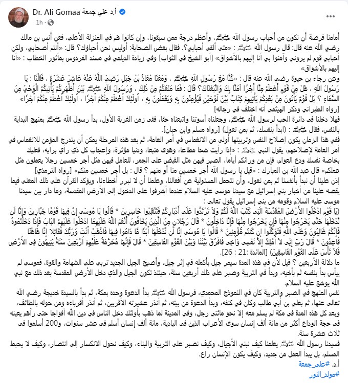 وكتب الدكتور علي جمعة "أمامنا فرصة أن نكون من أحباب رسول الله ﷺ، وأعظم درجة ممن سبقونا، وإن كانوا هم في المنزلة الأعلى، فعن أنس بن مالك رضي الله عنه قال: قال رسول الله ﷺ: «متى ألقى أحبابي؟. فقال بعض الصحابة: أوليس نحن أحباؤك؟ قال: «أنتم أصحابي، ولكن أحبابي قوم لم يروني وآمنوا بي أنا إليهم بالأشواق» [أبو الشيخ في الثواب] وفي زيادة الديلمي في مسند الفردوس بمأثور الخطاب: «أنا إليهم بالأشواق»