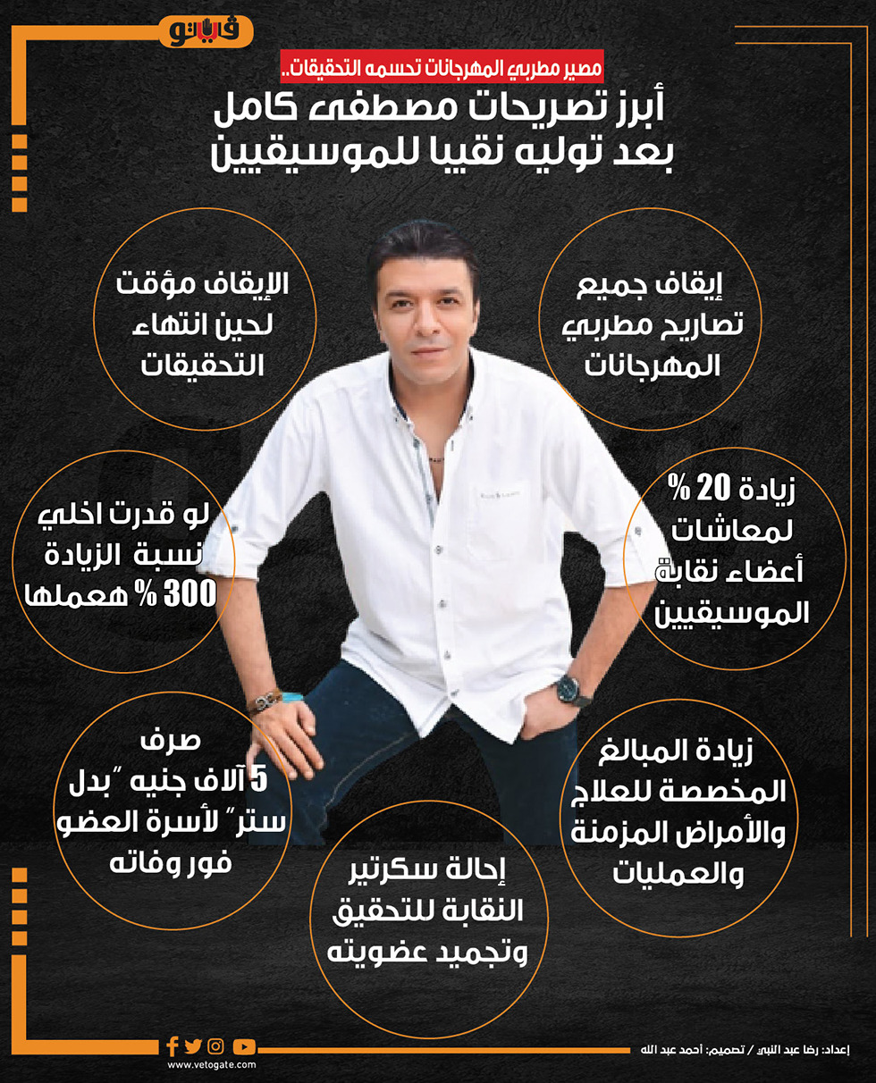 مصير مطربي المهرجانات تحسمه التحقيقات.. أبرز تصريحات مصطفى كامل بعد توليه نقيبا للموسيقيين| انفوجراف الأحد 16/أكتوبر/2022 - 05:38 م 10/16/2022 5:38:07 PM مصطفى كامل رضا عبدالنبى شارك طباعة 18 حجم الخط شارك طباعة مصطفي كامل مطربي المهرجانات تصريحات مصطفي كامل