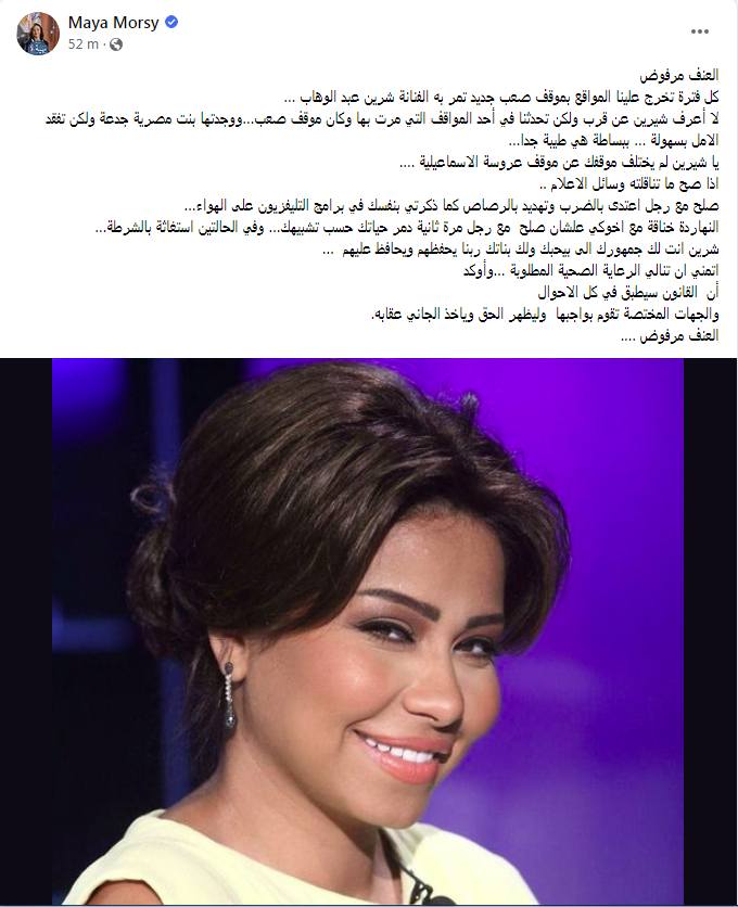 وكتبت مايا مرسي قائلة: "العنف مرفوض.. كل فترة تخرج علينا المواقع بموقف صعب جديد تمر به الفنانة شيرين عبد الوهاب … لا أعرف شيرين عن قرب ولكن تحدثنا في أحد المواقف التي مرت بها وكان موقف صعب…ووجدتها بنت مصرية جدعة ولكن تفقد الأمل بسهولة … ببساطة هي طيبة جدا".