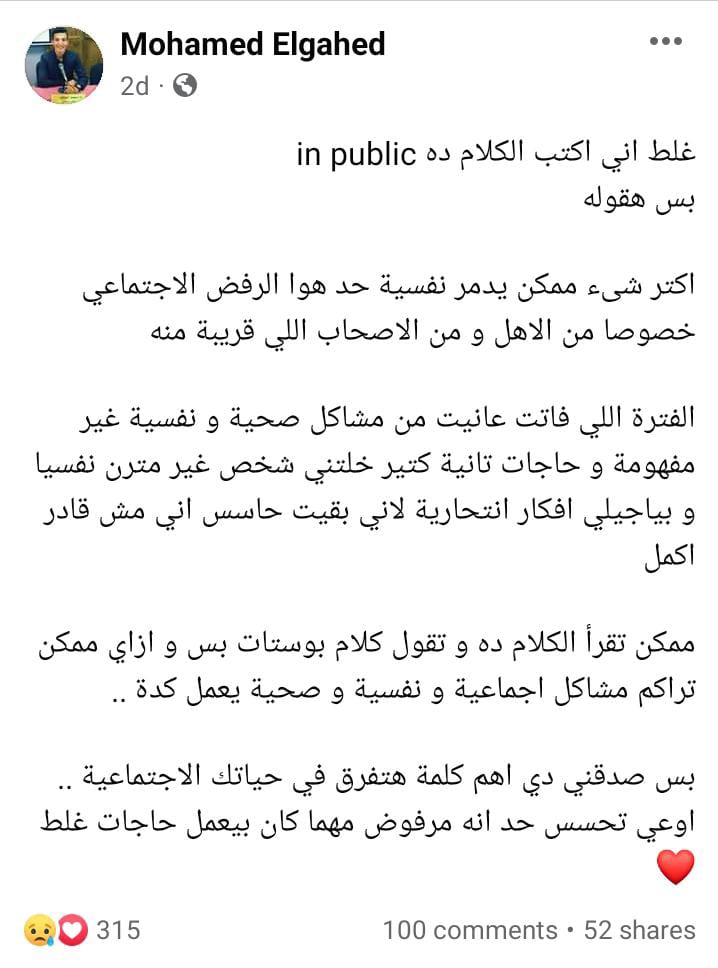 كان الطالب المنتحر كتب علي صفحته منذ يومين: (اكتر شىء ممكن يدمر نفسية حد هوا الرفض الاجتماعي خصوصا من الأهل ومن الاصحاب اللي قريبة منه.