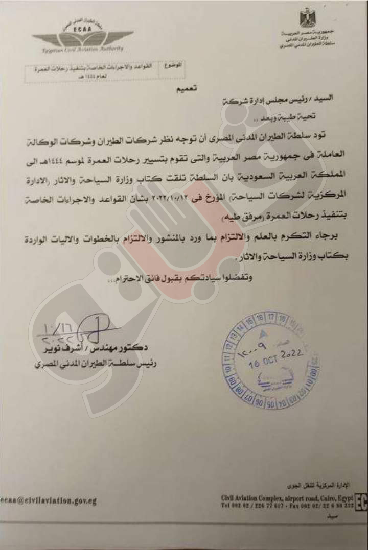 وطالبت وزارة السياحة والآثار في خطابها الموجه الي سلطة الطيران المدنى بمطابقة بيانات الخاصة لكل معتمر مع البيانات المسجلة ببوابة العمرة المصرية قبل مغادرة مصر، بالإضافة إلي التزام جميع الشركات الناقلة للمسافرين بما جاء في هذه المادة وضرورة التأكد من إدراج بيانات المعتمر أو المسافر بتأشيرة تسمح لحاملها بأداء المناسك العمرة على البوابة المصرية للعمرة وذلك قبل إصدار تصريح الصعود إلى الطائرة حرصا على عدم تعطيل إقلاع طائرة، وذلك من خلال حساب شركة الطيران المنشأ على البوابة باسم المستخدم وكلمة المرور الخاصة بها واستخدام المتصفح جوجل كروم.
