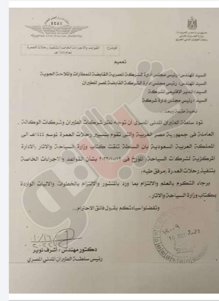 وقالت مصادربوزارة السياحة والآثار، أن سلطة الطيران المدنى عممت منشورًا علي كافة شركات الطيران بمنع صعود أي راكب متجه إلي المملكة العربية السعودية بدون الحصول على باركود بوابة العمرة المصرية.