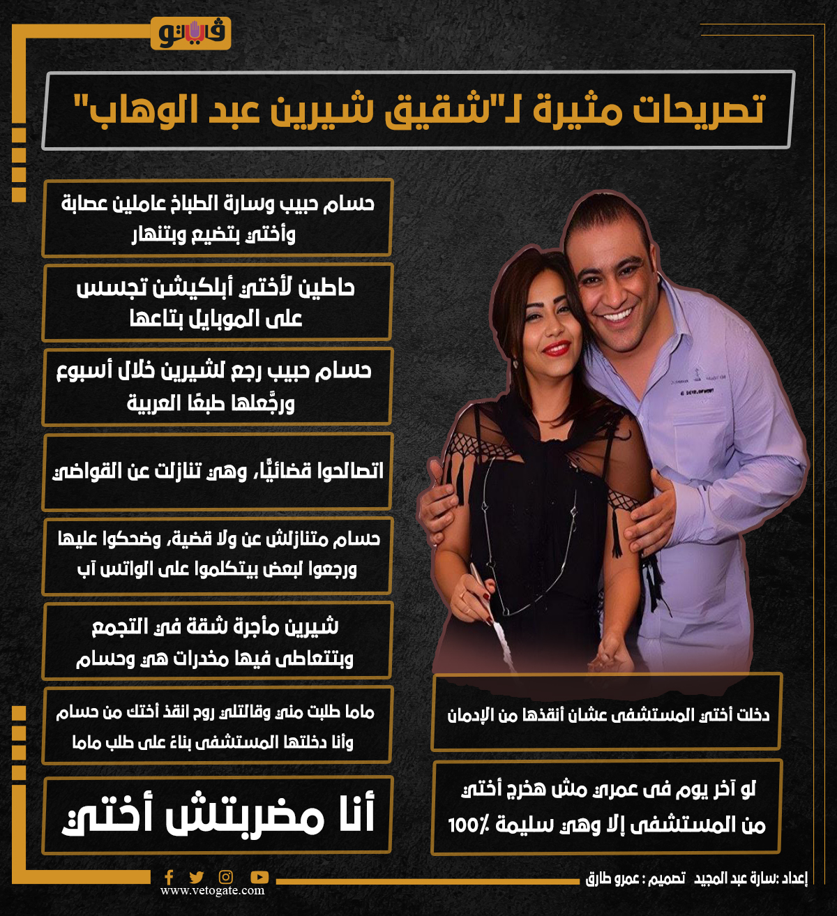 تصريحات مثيرة لـ"شقيق شيرين عبد الوهاب" | إنفوجراف الإثنين 17/أكتوبر/2022 - 03:02 ص 10/17/2022 3:02:27 AM شيرين وشقيقها سارة عبد المجيد شارك طباعة 18 حجم الخط شارك طباعة حسام حبيب شقيق شيرين عبد الوهاب شيرين عبد الوهاب شيرين ادمان المخدرات أعمال شيرين
