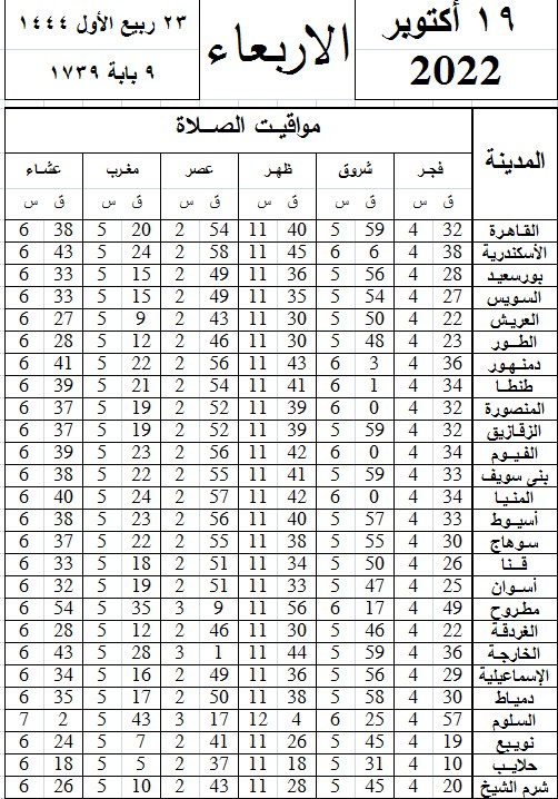 مواقيت الصلاة اليوم وفقًا للتوقيت المحلي لمدينتي القاهرة والإسكندرية وعدد من مدن ومحافظات الجمهورية من واقع بيانات الهيئة العامة للمساحة: