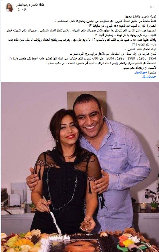 وكتبت خبيرة الطاقة مها العطار تدوينة على الفيس بوك: " تورتة شيرين وتقطيع وجهها علقة ساخنة من شقيق الفنانة شيرين ادي لسقوطها من البلكون وحجزها داخل المستشفى؟! الصورة ابلغ رد للسبب في تقطيع وجه شيرين من شقيقها؟!"