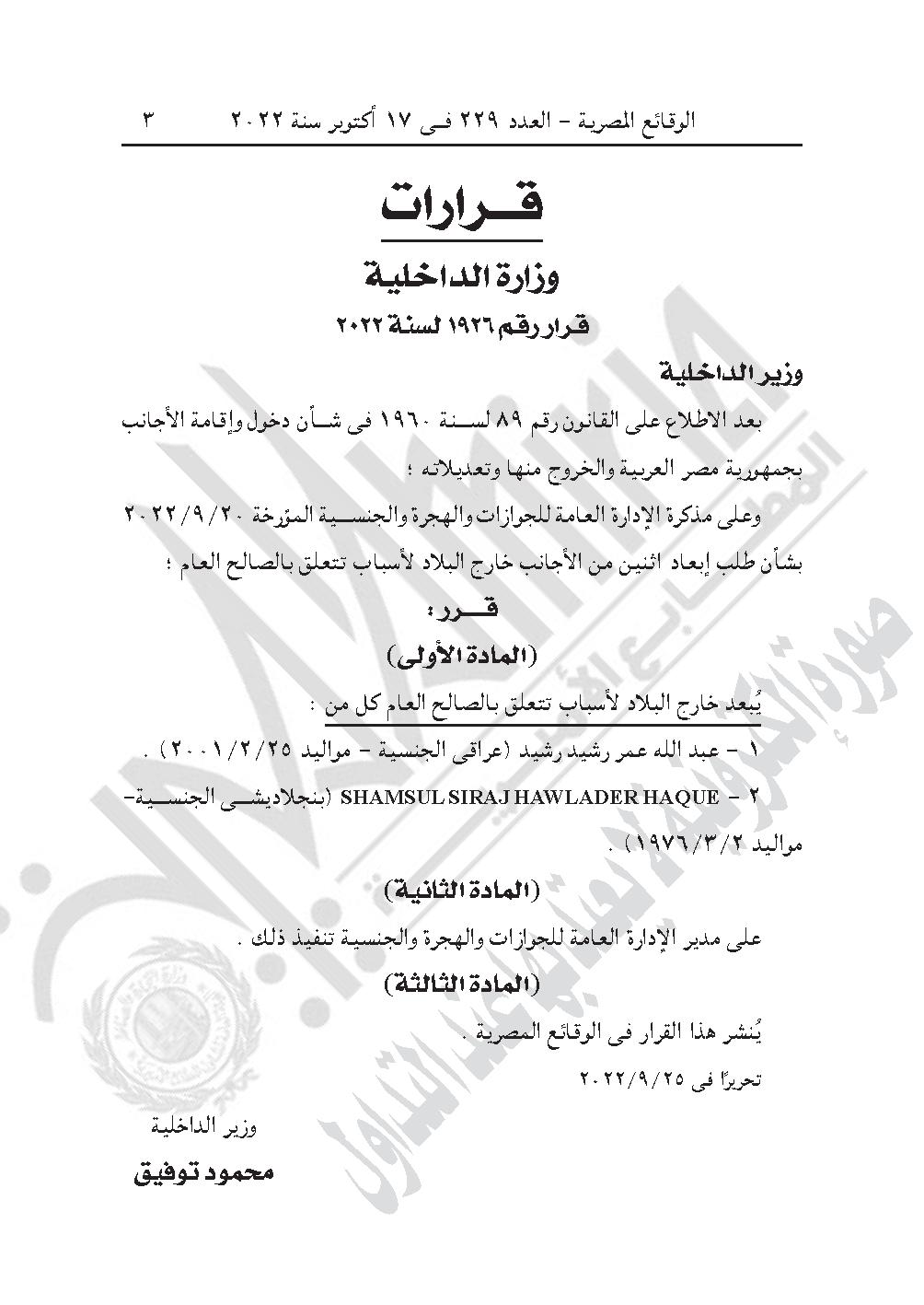 -قرار وزارة الداخلية رقم 1926 لسنة 2022، بشأن إبعاد عبد الله عمر رشيد (عراقي الجنسية، مواليد 25/2/2001)، وSHAMSUL SIRAJ HAWLADER HAQUE (بنجلاديشي الجنسية، مواليد 2/3/1976)، من البلاد لأسباب تتعلق بالصالح العام.