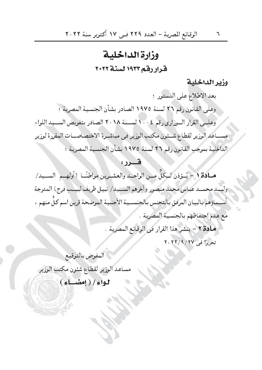 -وقرار وزارة الداخلية رقم 1933 لسنة 2022، بالأذن لكل من الواحد والعشرين مواطنًا (أولهم وليد محمد عباس محمد منصور، وآخرهم نبيل ظريف لبيب فرج)، المدرجة أسماؤهم بالبيان المرفق بالتجنس بالجنسية الأجنبية، الموضحة قرين اسك كل منهم، مع عدم احتفاظهم بالجنسية المصرية.