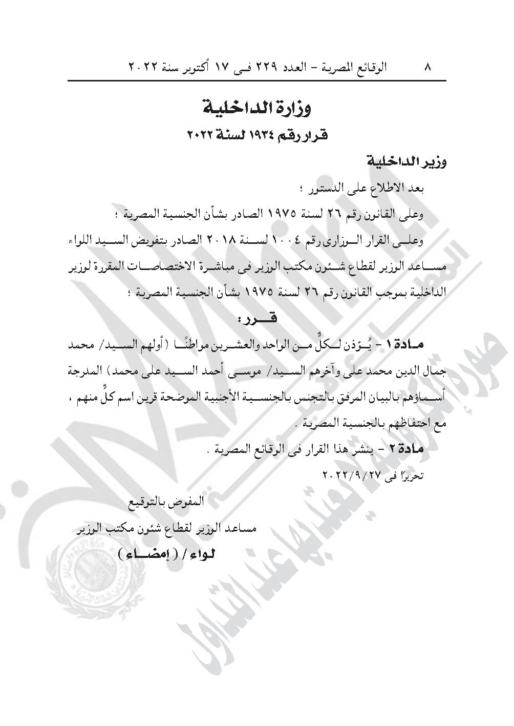 -وقرار وزارة الداخلية رقم 1934 لسنة 2022، بالأذن لكل من الواحد والعشرين مواطنًا (أولهم محمد جمال الدين محمد علي، وآخرهم موسى أحمد السيد علي محمد)، المدرجة أسماؤهم بالبيان المرفق بالتجنس بالجنسية الأجنبية، الموضحة قرين اسك كل منهم، مع احتفاظهم بالجنسية المصرية.