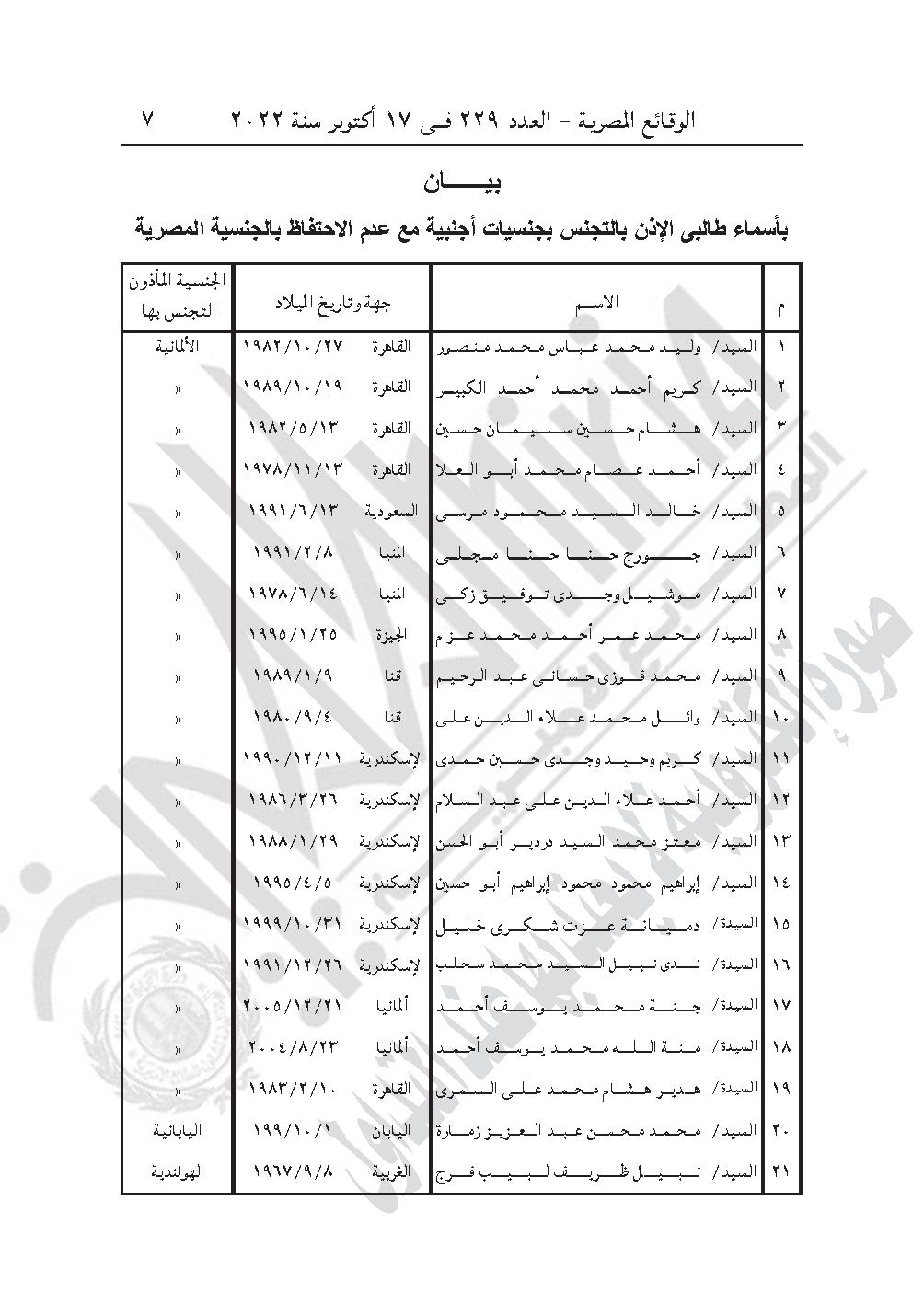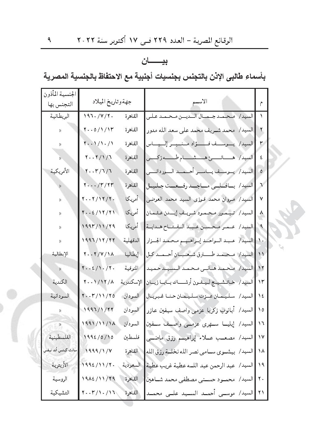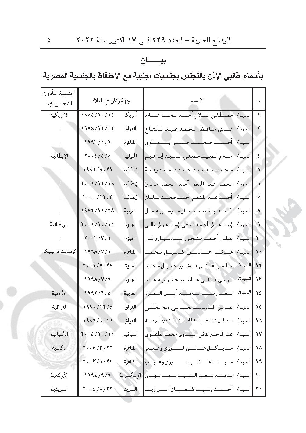 -وقرار وزارة الداخلية رقم 1927 لسنة 2022، بالأذن لكل من الواحد والعشرين مواطنًا (أولهم مصطفى صلاح أحمد محمد عماره، وآخرهم أحمد وليد شعبان أبو زيد)، المدرجة أسماؤهم بالبيان المرفق بالتجنس بالجنسية الأجنبية، الموضحة قرين اسم كل منهم، مع احتفاظهم بالجنسية المصرية.