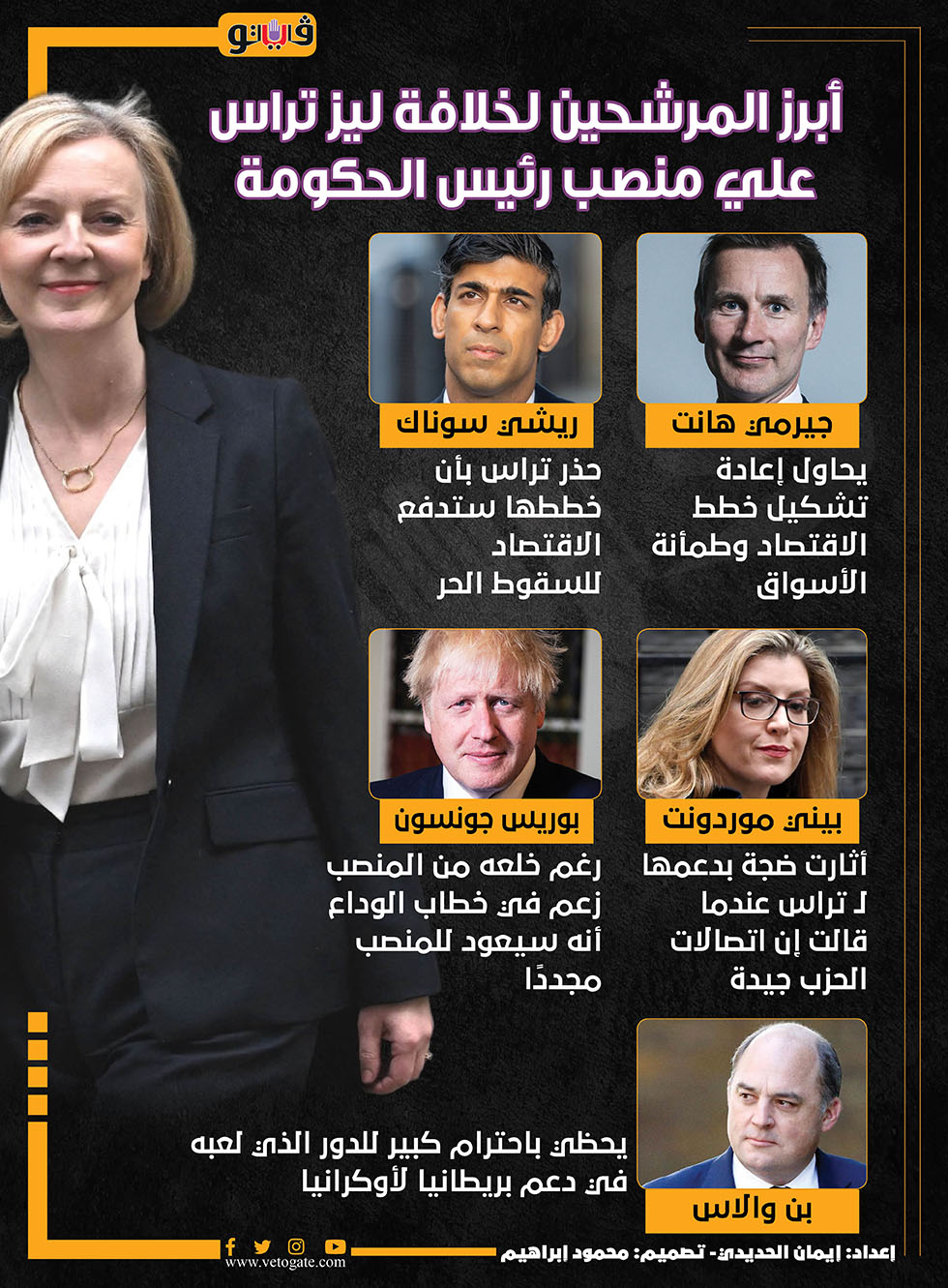 أبرز المرشحين لخلافة ليز تراس علي منصب رئيس الحكومة| إنفوجراف الخميس 20/أكتوبر/2022 - 03:23 م 10/20/2022 3:23:31 PM مرشحين لخلافة ليز تراس إيمان الحديدى شارك طباعة 18 حجم الخط شارك طباعة بريطانيا رئيسة الحكومة ليز تراس بوريس جونسون أوكرانيا جيرمي هانت جونسون