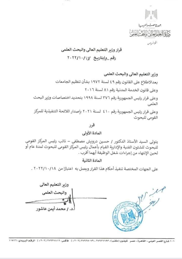 قرر وزير التعليم العالي والبحث العلمي الدكتور محمد أيمن عاشور، تعيين الدكتور حسين درويش، نائب رئيس المركز القومي للبحوث، للشئون الفنية والإدارية، للقيام بأعمال رئيس المركز القومي للبحوث لمدة عام، أو لحين الانتهاء من إجراءات شغل الوظيفة أيهما أقرب.