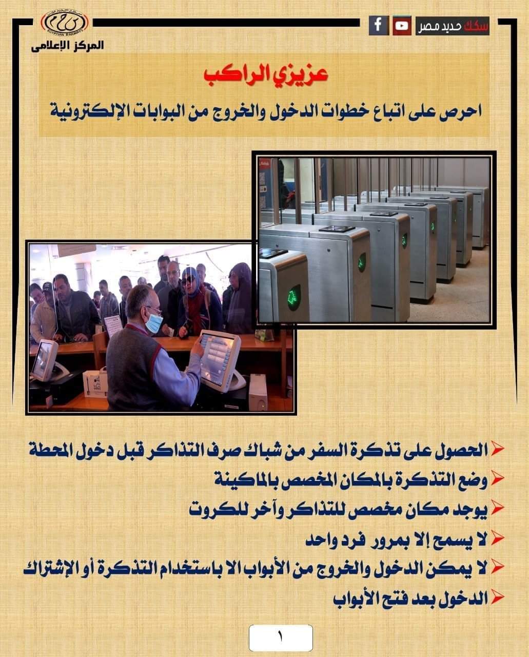 وناشد الهيئة جمهور الركاب الاحتفاظ بالتذكرة حتى محطة الوصول حتى يتم السماح لهم بالمرور من خلال البوابات الالكترونية أو بعد اطلاع الكمسارية الموجودين بأبواب المحطات على تذكرة السفر سواء للدخول أو الخروج من المحطات، وذلك لحين الانتهاء من تركيب البوابات الإلكترونية بباقي المحطات تجنبًا لدفع لغرامة وذلك حفاظًا على موارد الهيئة.