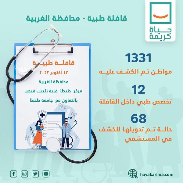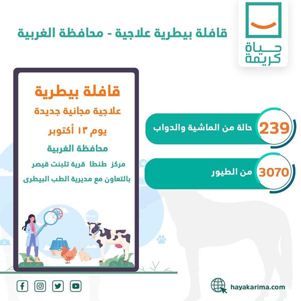 - وصول قطار القوافل الطبية إلى محافظة الغربية، وبتعاون مشترك بين جامعة طنطا ومؤسسة حياة كريمة لتنظيم قافلة طبية بيطرية بمركز طنطا قرية تلبنت قيصر.
