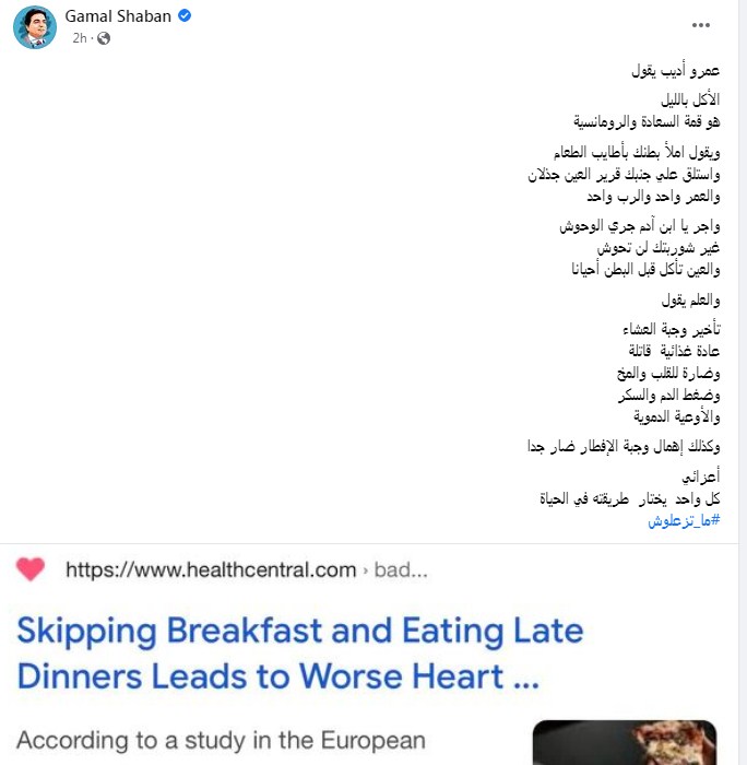 وكتب جمال شعبان تدوينة على فيس بوك قال فيها: "عمرو أديب يقول الأكل بالليل هو قمة السعادة والرومانسية.. ويقول املأ بطنك بأطايب الطعام واستلق على جنبك قرير العين والعمر واحد والرب واحد.. واجر يا ابن آدم جري الوحوش غير شوربتك لن تحوش.. والعين تأكل قبل البطن أحيانا.. لكن العلم يقول أن تأخير وجبة العشاء عادة غذائية قاتلة وضارة للقلب والمخ وضغط الدم والسكر والأوعية الدموية وكذلك إهمال وجبة الإفطار ضار جدا"
