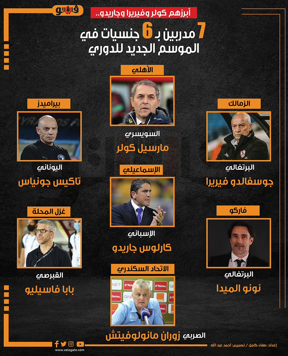 أبرزهم كولر وفيريرا وجاريدو..7 مدربين بـ 6 جنسيات في الموسم الجديد للدوري | إنفوجراف الأربعاء 19/أكتوبر/2022 - 08:32 م 10/19/2022 8:32:55 PM مارسيل كولر صفاء كامل شارك طباعة 18 حجم الخط شارك طباعة المدربين الاجانب سبع مدربين الموسم الجديد الأهلي