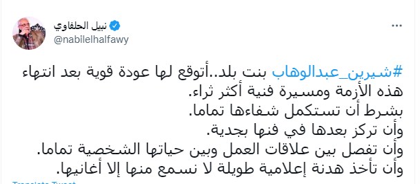 وكتب نبيل الحلفاوي تغريدة على تويتر وجهها للفنانة شيرين عبد الوهاب فقال: "#شيرين_عبدالوهاب بنت بلد..أتوقع لها عودة قوية بعد انتهاء هذه الأزمة ومسيرة فنية أكثر ثراء."