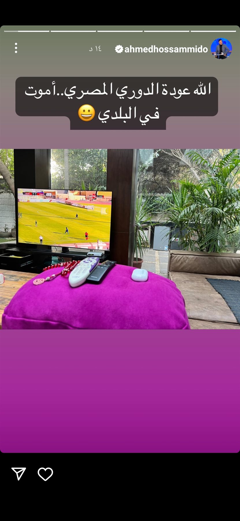 ونشر أحمد حسام ميدو " ستوري " عبر صفحته الرسمية على موقع التواصل الإجتماعي انستجرام صورة من مباراة أسوان والاتحاد وكتب: الله عودة الدوري المصري.. أموت في البلدي.