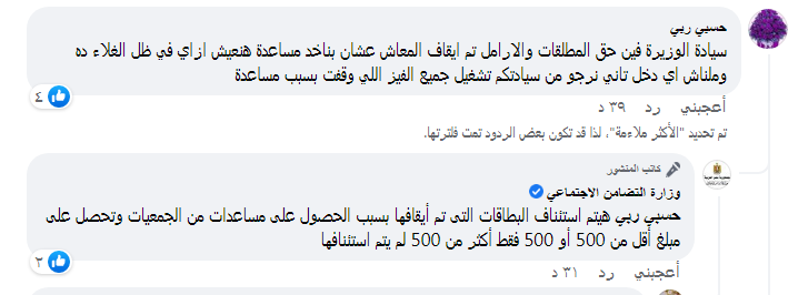 وأكدت الصفحة الرسمية لوزارة التضامن الاجتماعي على عودة استئناف البطاقات لمن يحصل على مساعدات أقل من 500 أو 500 فقط؛ أما أكثر من 500 لم يتم استئنافها.