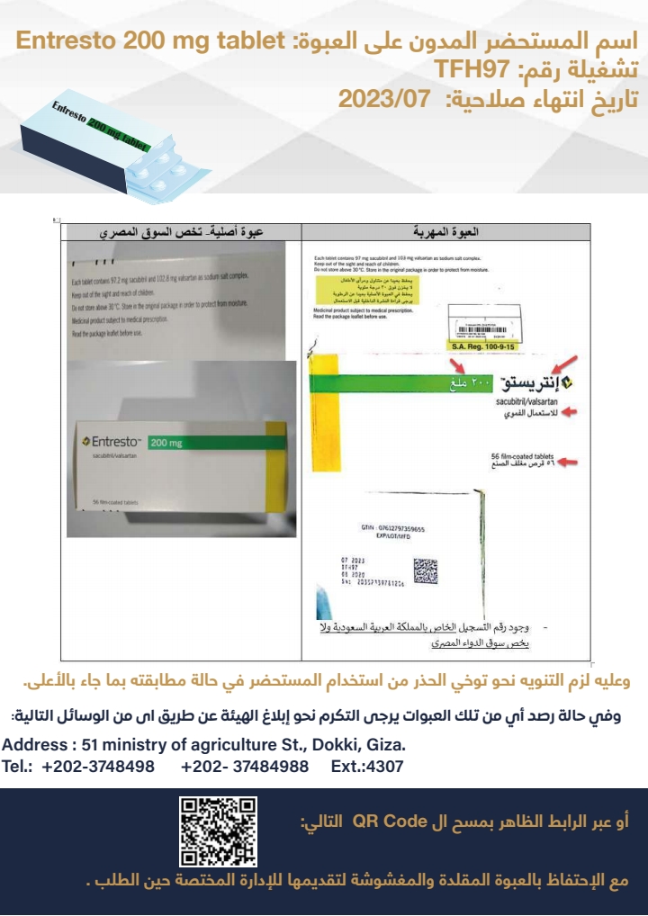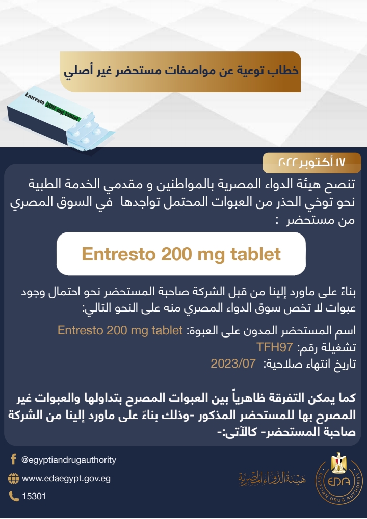 أصدرت هيئة الدواء المصرية خطاب توعية للمواطنين بشأن مستحضر غير أصلي مغشوش Entresto يستخدم لعلاج ارتفاع ضغط الدم.