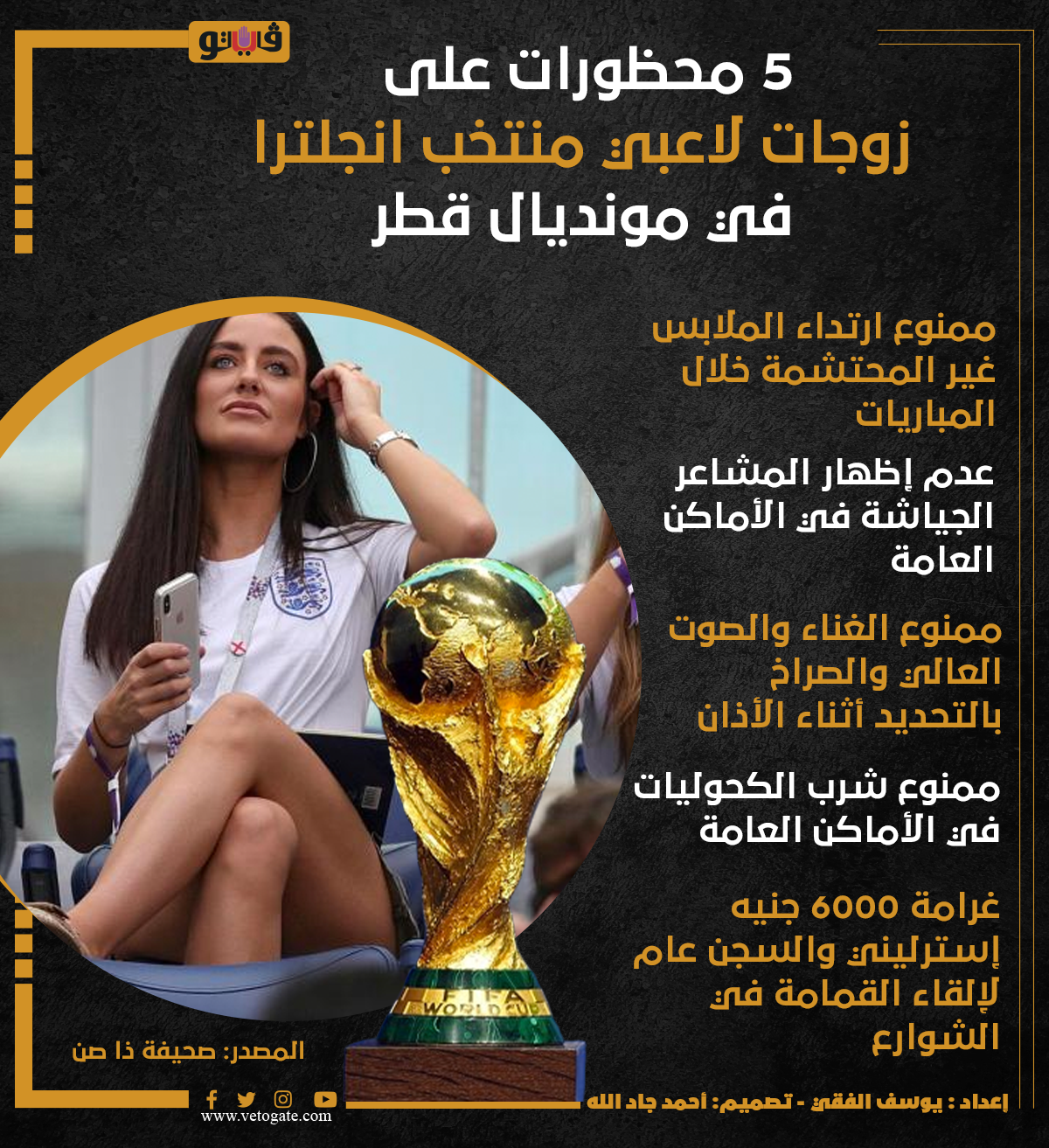 5 محظورات على زوجات لاعبي منتخب انجلترا في مونديال قطر | إنفوجراف الأربعاء 19/أكتوبر/2022 - 11:53 ص 10/19/2022 11:53:25 AM كأس العالم يوسف الفقي شارك طباعة 18 حجم الخط شارك طباعة كأس العالم قائمة المحظورات في كأس العالم كأس العالم في قطر زوجات لاعبي المنتخب الإنجليزي قائمة المحظورات في قطر بكأس العالم