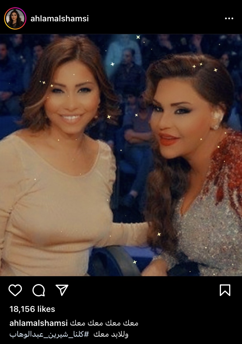 نشرت أحلام صورة تجمعها بشيرين، وعلقت عليها قائلة: "معك معك معك.. وللأبد معك.. كلنا شيرين عبد الوهاب".