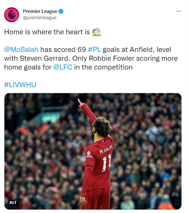 وكتبت صفحة الدوري الإنجليزي الممتاز "بريميرليج" عبر تويتر "مكانه حيث يوجد القلب.. محمد صلاح أحرز 69 هدفًا في الدوري الإنجليزي الممتاز على ملعب إنفيلد، بالتساوي مع ستيفن جيرارد. روبي فاولر هو الوحيد الذي سجل المزيد من الأهداف على أرضه".