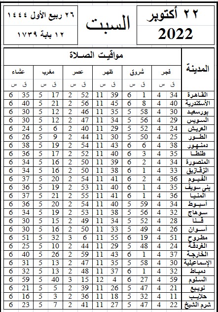 مواقيت الصلاة اليوم وفقًا للتوقيت المحلي لمدينتي القاهرة والإسكندرية وعدد من مدن ومحافظات الجمهورية من واقع بيانات الهيئة العامة للمساحة: