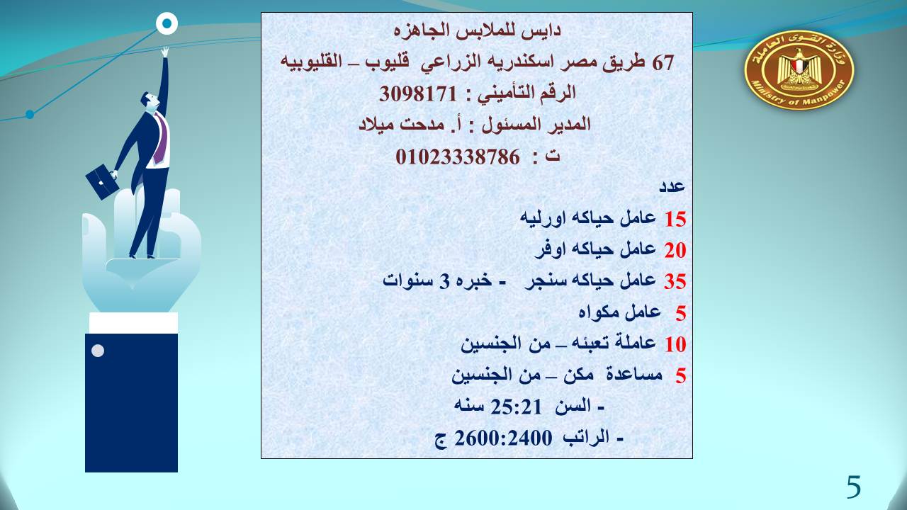 وقالت إيمان السيد مدير المديرية إن الوظائف تتمثل في: 2 مدرس لغة عربية،3 مدرسين لغة إنجليزية،3 مدرسين رياضيات،4 مدرسين حاسب آلى، 3 أطباء طوارئ،2 سكرتارية عيادات،2 فني تعقيم،2 فني اشاعه،5 مساعدين تمريض، 15 عاملا،2 أمين مخازن – خبرة سنتين،25 عامل إنتاج، مشرف انتاج - خبرة سنة،30 عامل مكن خياطة - خبرة سنتان،25 فنى جودة – خبرة 4 سنوات،25 بائعا، 15 عامل حياكه اورليه،20 عامل حياكه اوفر،35 عامل حياكه سنجر - خبره 3 سنوات،5 عاملين مكواه،10 عاملات تعبئه،5 مساعدات مكن، 16 عامل تفصيل ومقصار، 8 سائقين – رخصة أولى، ثانية، ثالثة.