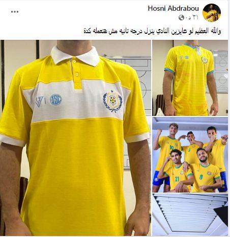ونشر حسني عبدربه صورا للزي الرسمي للفريق الأول وأزمة التعاقد مع شركتين معلقا عليها:" والله العظيم لو عايزين النادي ينزل درجة تانيه مش هتعمله كده".