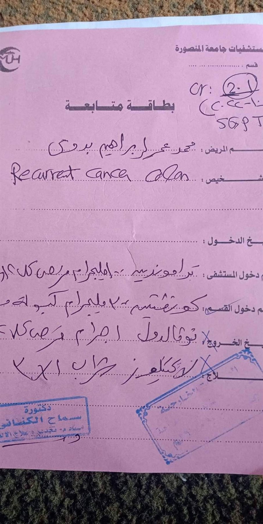 إحنا غلابة ومش قادرين على علاجه.. أسرة مريض سرطان بالدقهلية تستغيث لإنقاذ حياته