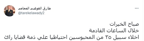وكتب طارق العوضي تغريدة عبر تويتر: "صباح الخيرات خلال الساعات القادمة إخلاء سبيل ٣٥ من المحبوسين احتياطيا علي ذمة قضايا رأي". وقال في تغريدة سابقة: "الحمد لله كثيرا بشرة خير بنهاية هذا الأسبوع".