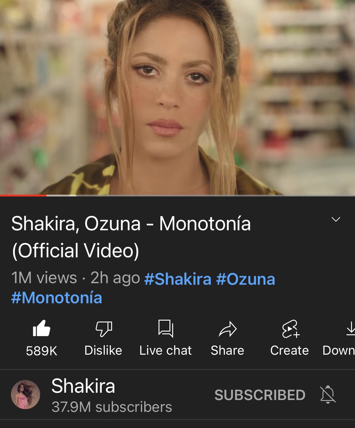 وحققت شاكيرا ٨ ملايين مشاهدة في ٨ ساعات، كما حقق أول مليوني مشاهدة لفيديو كليب أغنية Monotonía، في ساعتين فقط، أي بما يعادل مليون مشاهدة لكل ساعة.