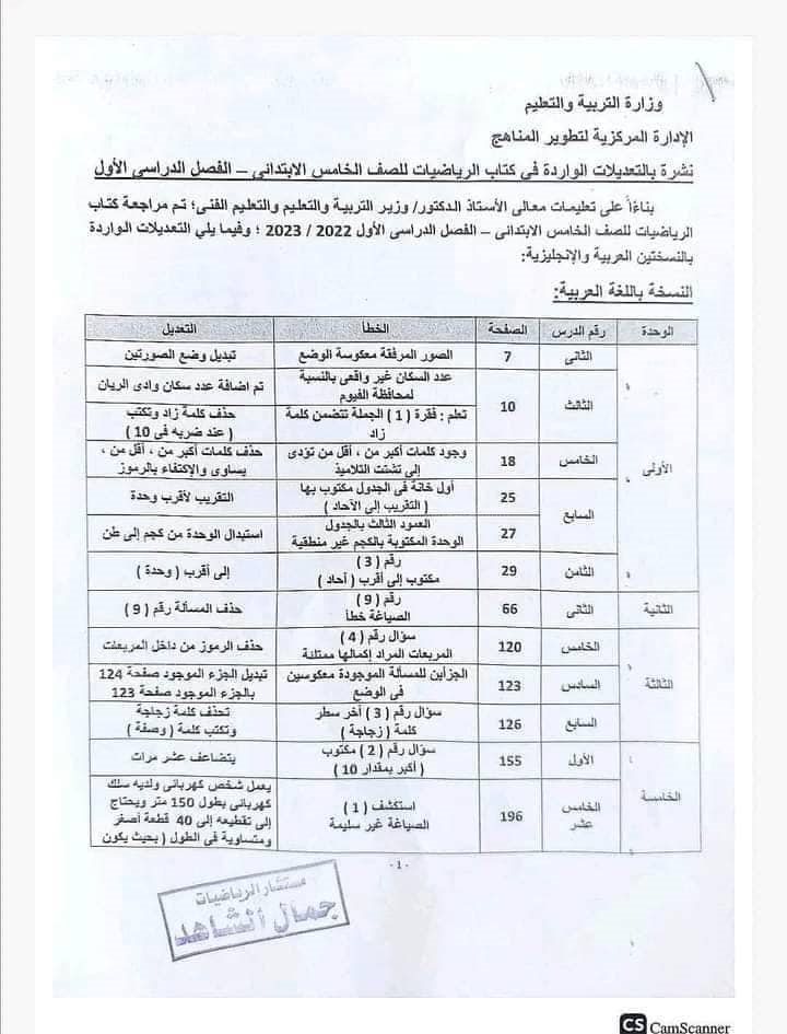 وجهت الإدارة المركزية لتطوير المناهج بوزارة التربية والتعليم والتعليم الفني، خطابا عاجلا لجميع المديريات التعليمية بشأن تعديلات بكتاب مادة الرياضيات للصف الخامس الابتدائي للفصل الدراسي الأول للعام الدراسي 2022-2023.